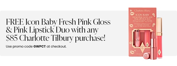 Receive a free gift of a Icon Baby Fresh Pink Gloss & Pink Lipstick Duo with any $85 Charlotte Tilbury purchase (before tax) made on www.revolve.com ('GWP'). Limit: one (1) GWP per person. GWP is not valid for pre-order items, cancelled orders, special orders, or gift cards. GWP not redeemable for cash. Quantities limited. While supplies last, no rainchecks. GWP size and color will be selected for you (as applicable) – no substitutions or returns will be accepted. The GWP will be shipped with qualifying purchase. GWP not available for previous purchases, and GWP offer cannot be combined with any other discount or offer. Offer terms are subject to change, termination, and/or cancellation at any time without notice.